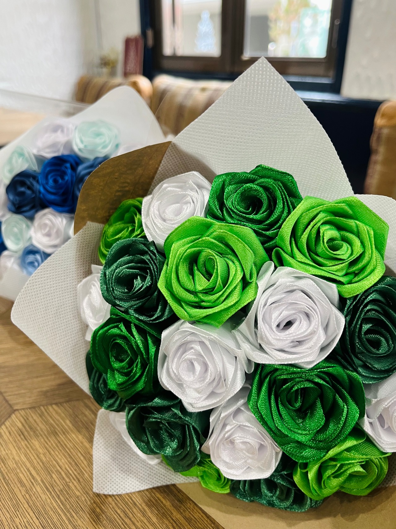 見て頂きありがとうございます!こちらは、サテンリボンで作られた華やかなミニブーケです‼️