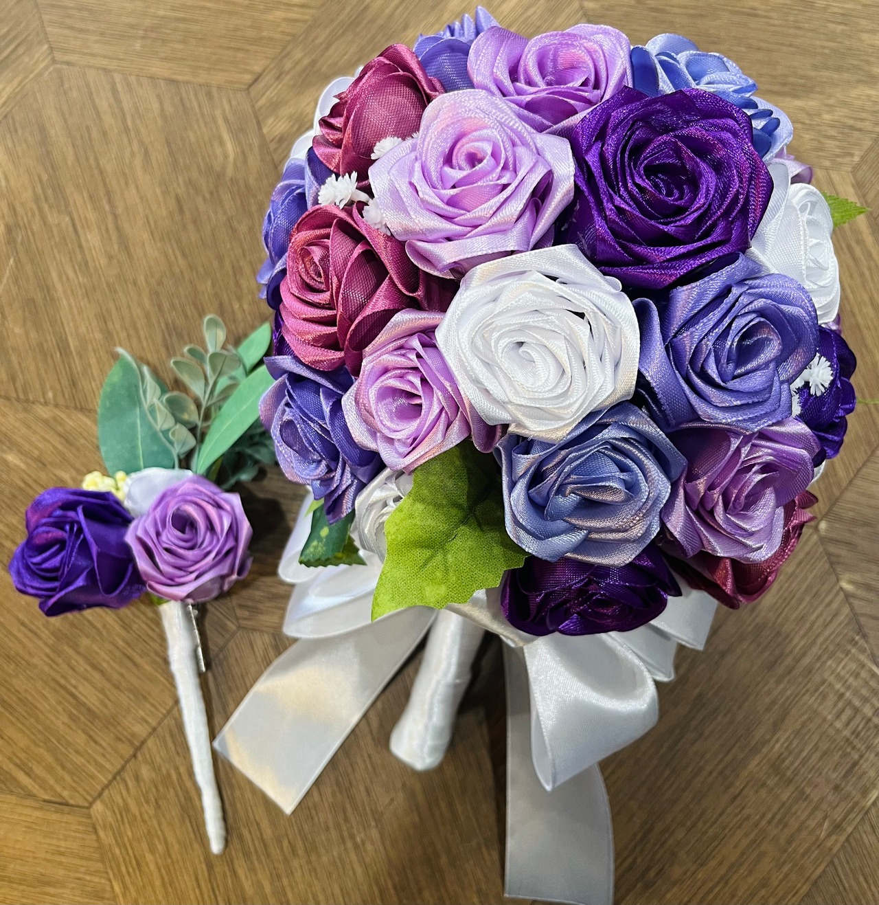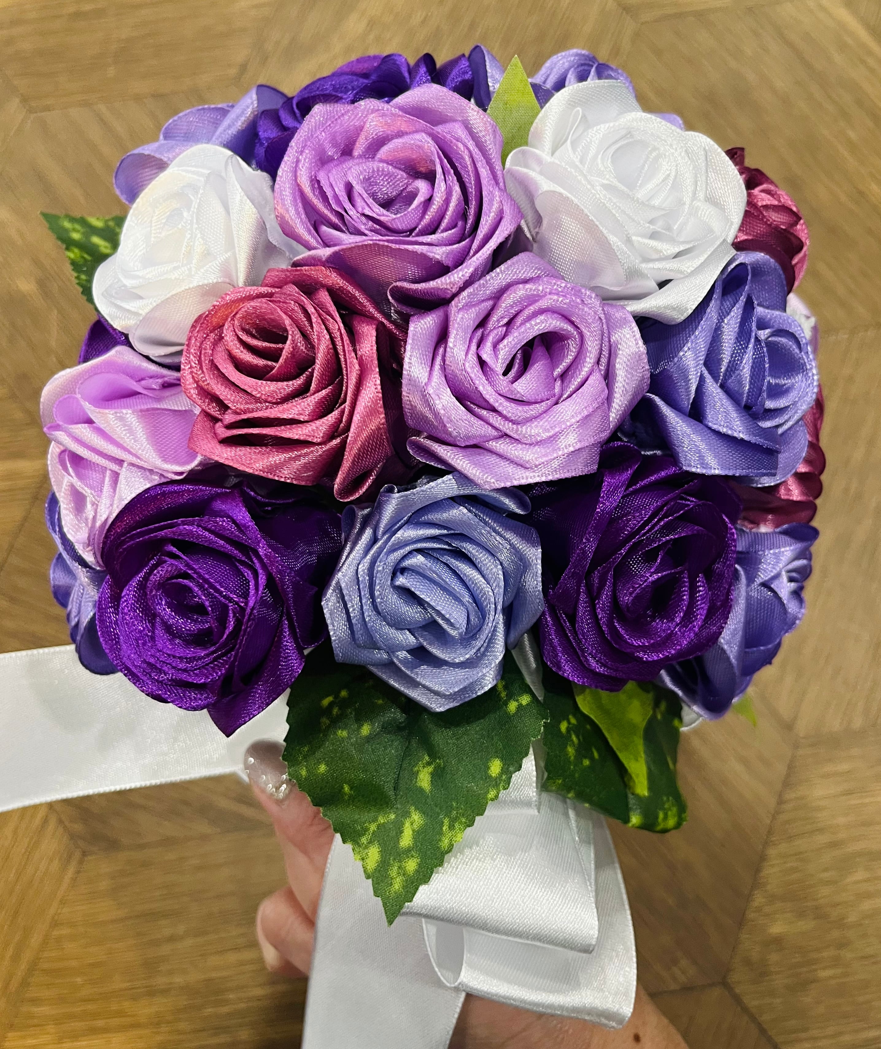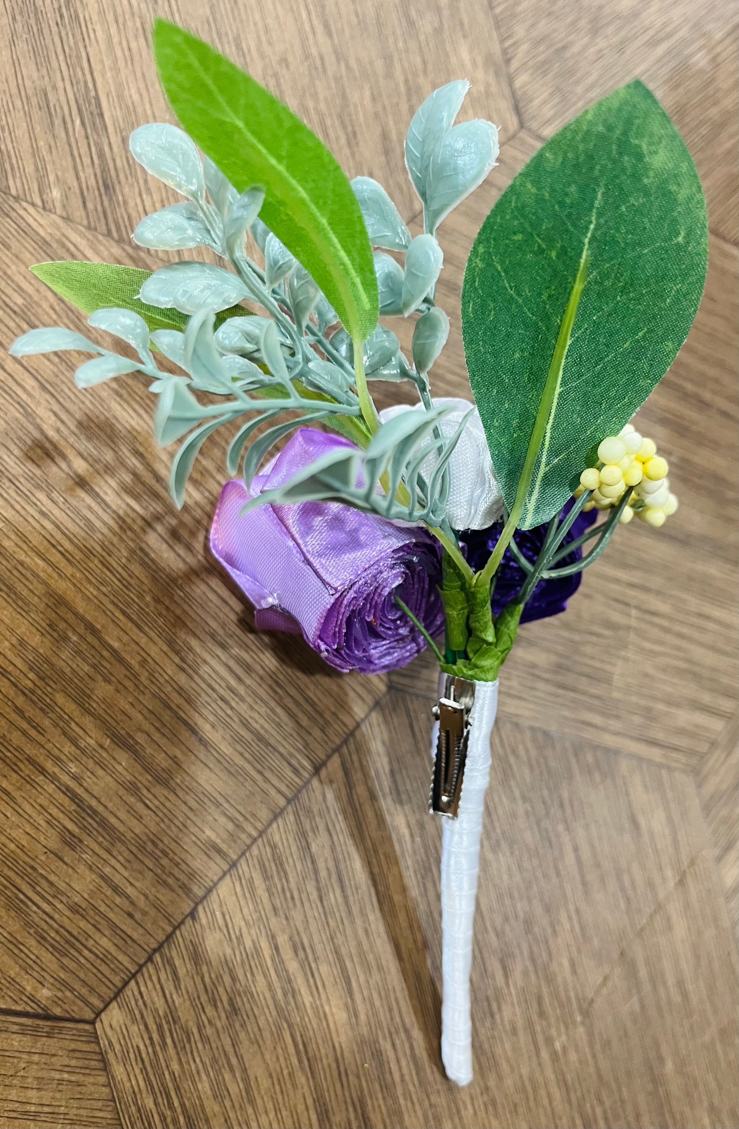 ○バラの本数:濃淡様々な紫色、白色 合わせてラウンドブーケ約43本 ブートニア2本